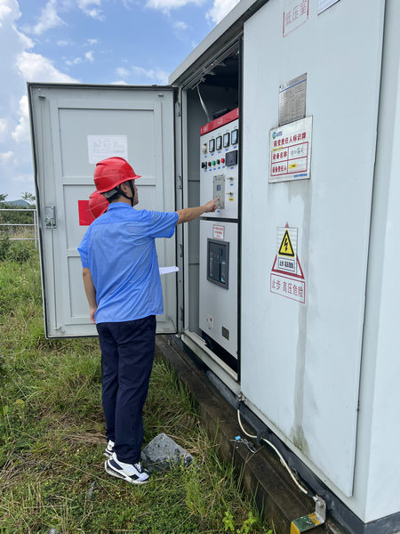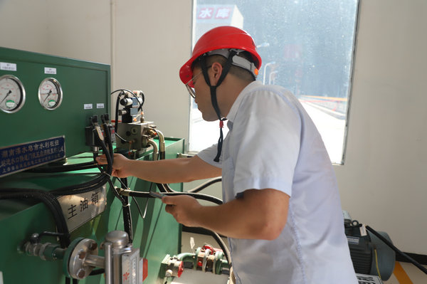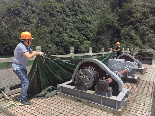 澧水公司索溪分公司副經(jīng)理袁國金與工程管理人員對大壩防汛設備進行檢查維護