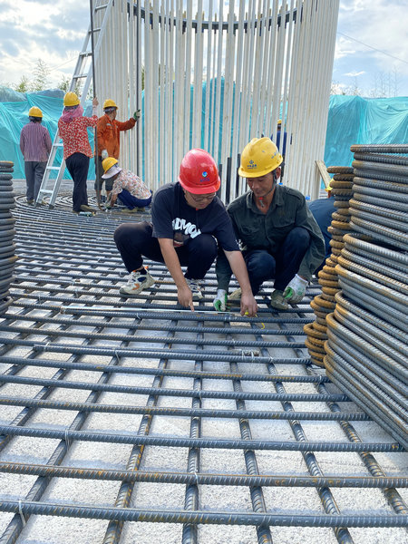 澧水公司白竹磨子嶺項目部主管羅振華在烈日下與施工工人復核鋼筋間距