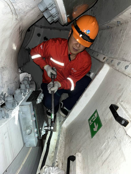 澧水公司新化大熊山風電場運維人員在風機塔筒內(nèi)緊固二次線路接線頭