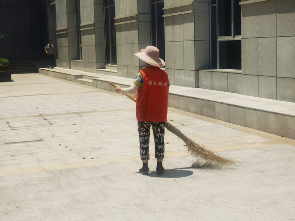 澧水公司物業(yè)保潔阿姨在烈日下清掃大院