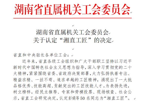 近日,湖南省直屬機(jī)關(guān)工會(huì)委員會(huì)發(fā)布《關(guān)于認(rèn)定“湘直工匠”的決定》,公司江埡水電站檢修部張桉榕同志榮獲“湘直工匠”稱號(hào)。
